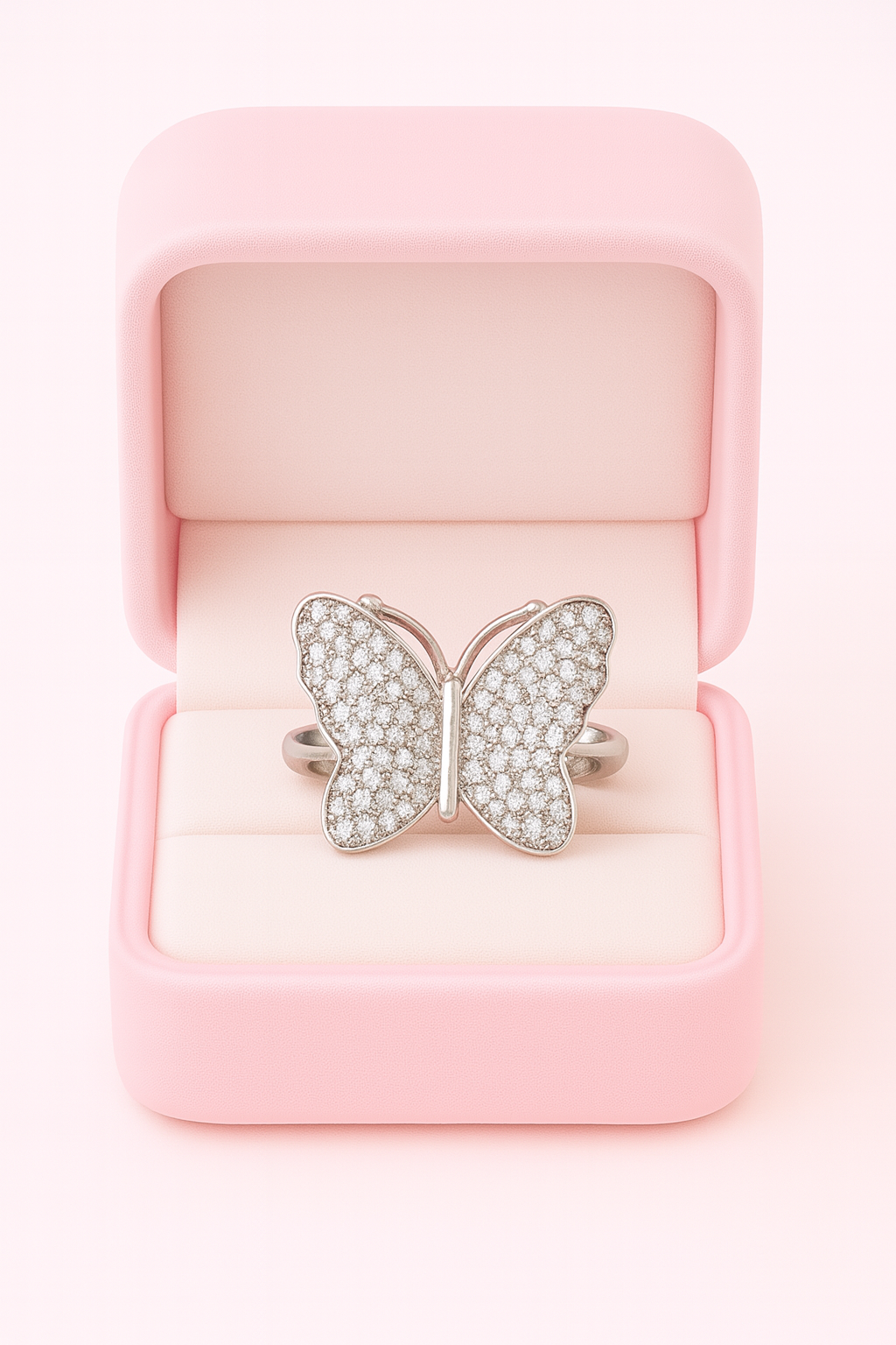 This ring blooms with a dazzling butterfly design, its wings covered in sparkling diamonds that shimmer like stardust. The delicate curves capture a sense of freedom and grace, making it feel alive with movement. It’s a joyful piece that brings together elegance and the beauty of nature’s charm.