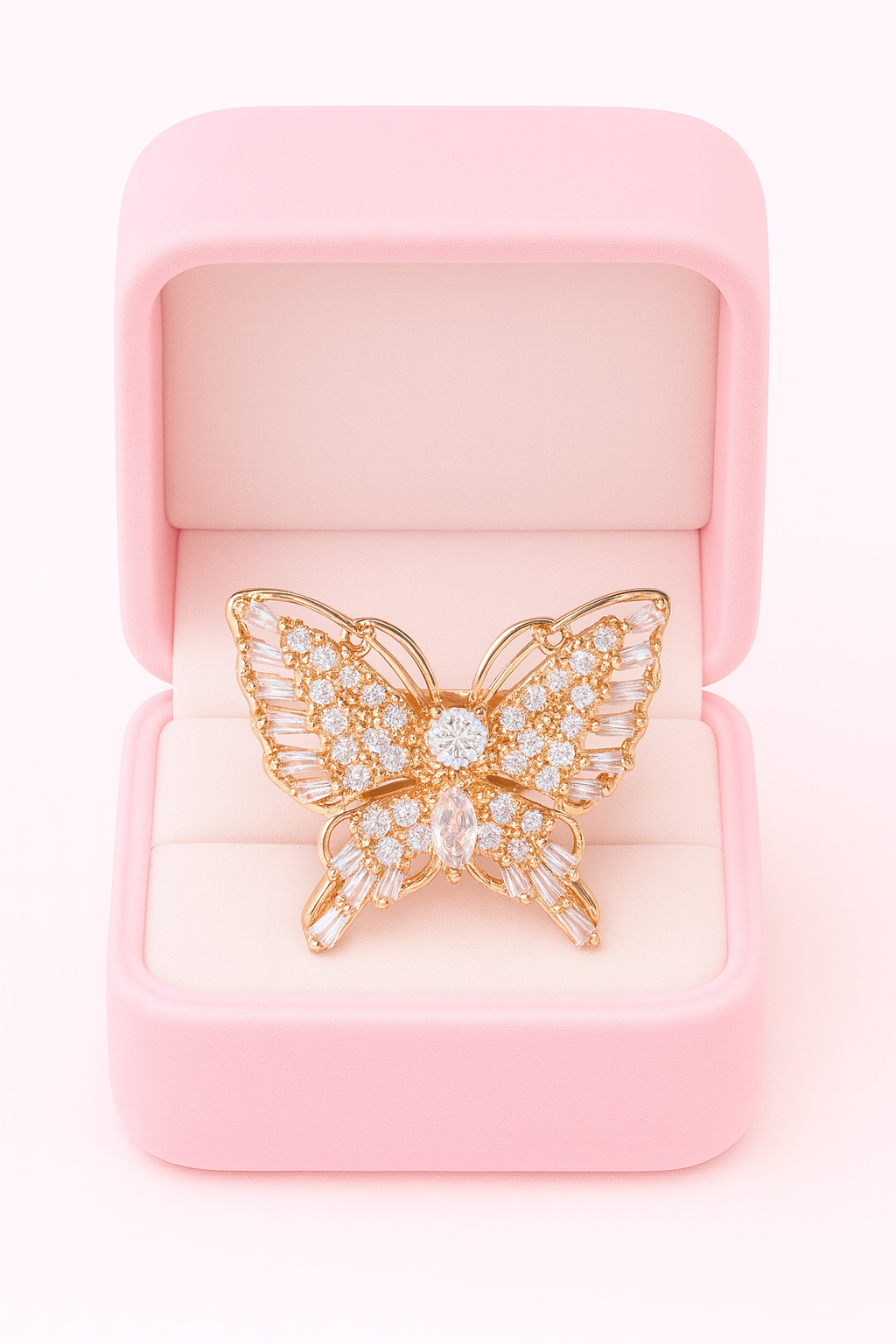 This ring takes the shape of a butterfly, its wings shimmering with a mix of round and baguette diamonds that sparkle with every angle. The golden frame adds warmth and richness, making the design feel both delicate and radiant. It carries a sense of freedom and joy, like wearing a little piece of nature’s beauty.