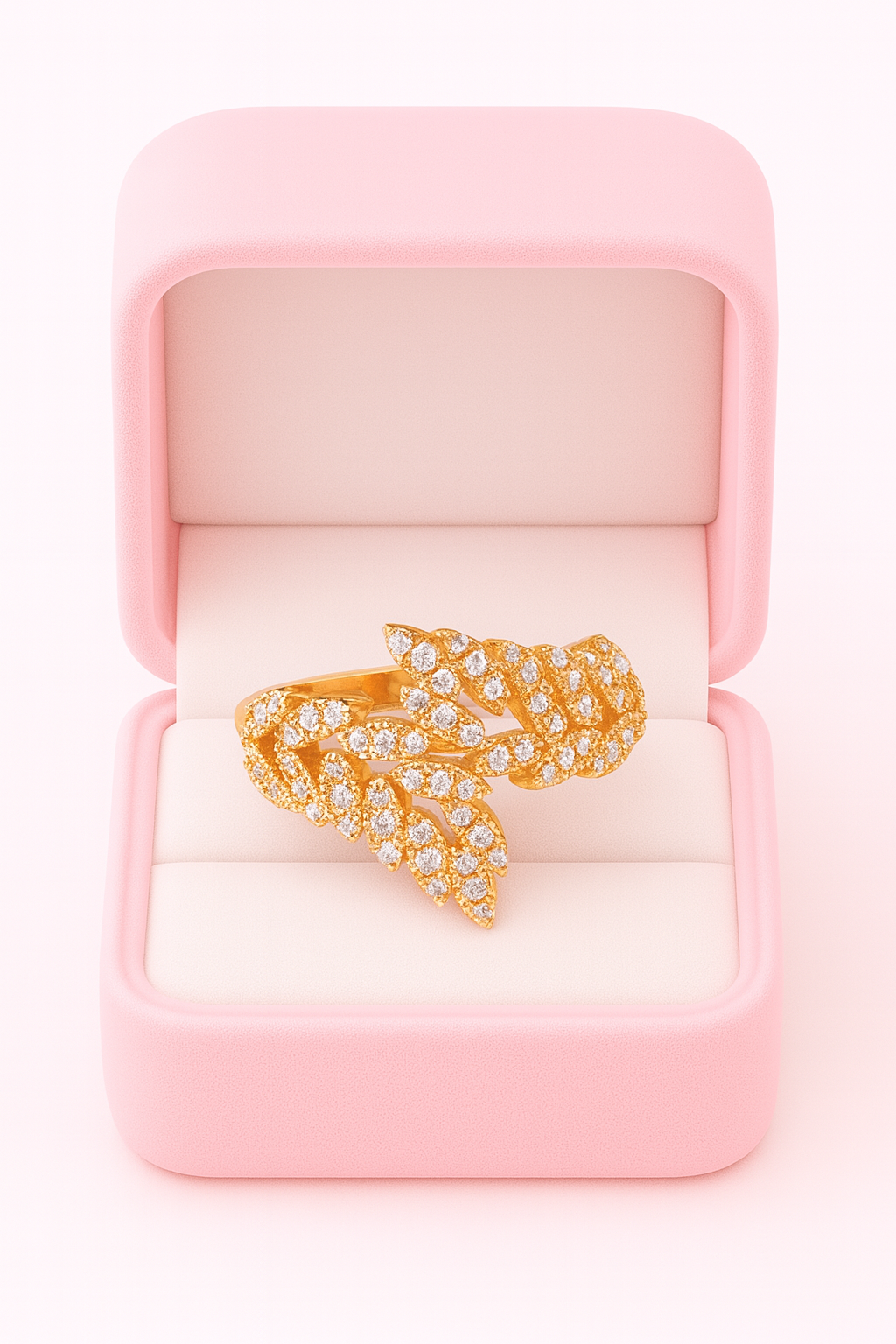 This ring glows with a golden leaf-inspired design, each curve encrusted with sparkling diamonds that catch the light beautifully. The open style gives it a natural, flowing elegance, as if it were shaped by nature itself. It feels vibrant and graceful, a piece that blends luxury with the charm of organic beauty.