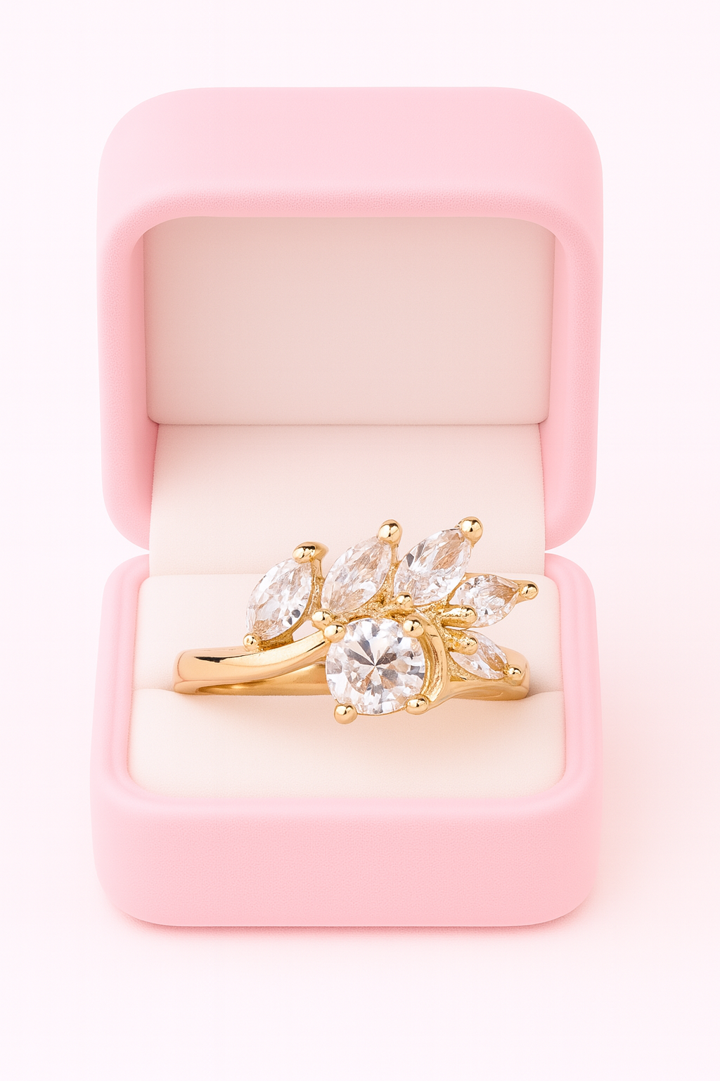 This ring features a brilliant round center stone surrounded by marquise-cut gems that blossom outward like delicate petals. The golden band curves gently, giving the piece a natural, graceful flow. It carries a romantic charm, blending elegance with the beauty of nature’s design.