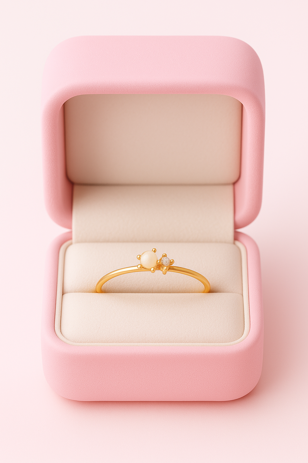 This minimalist gold ring features a small pearl and diamond-like stone side by side.