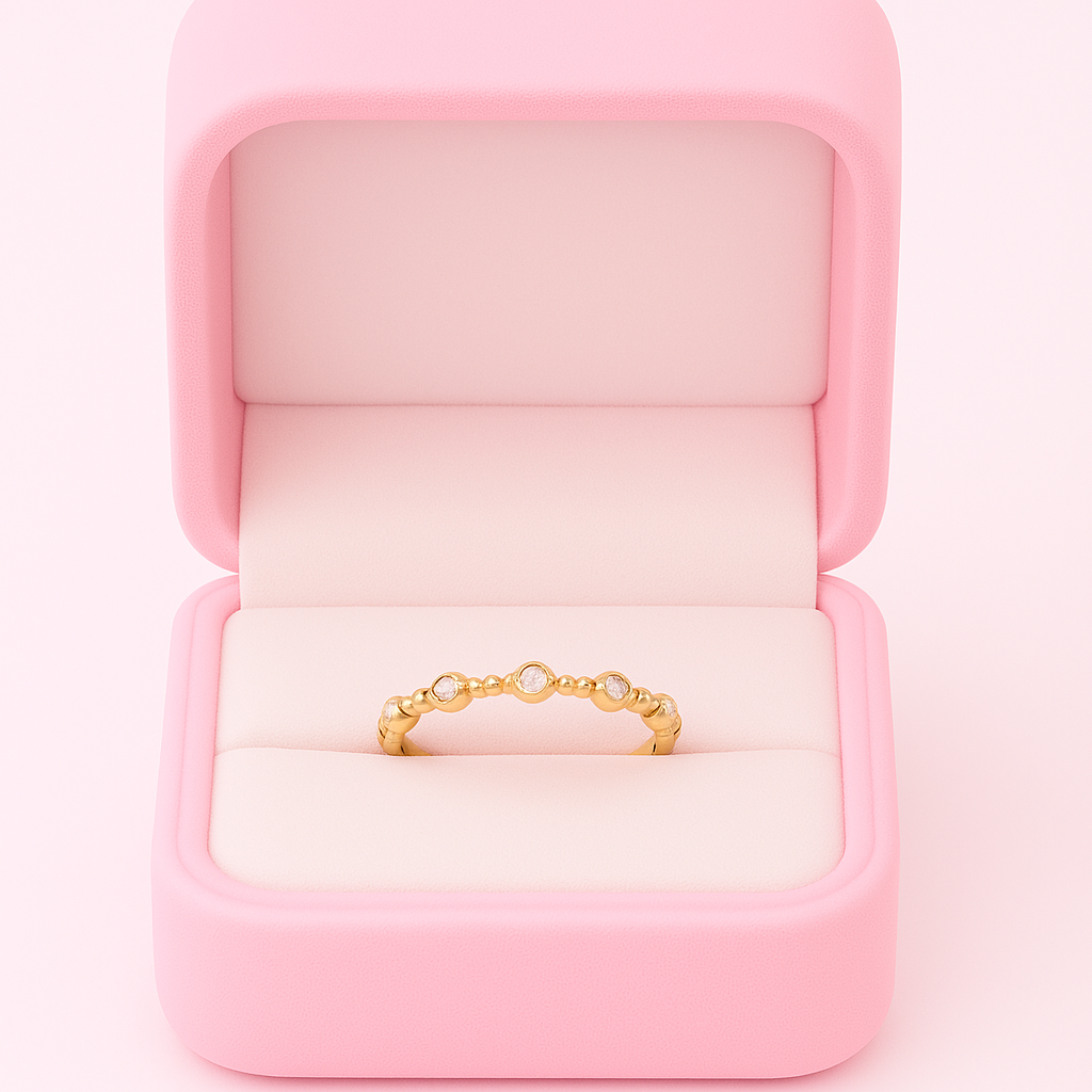 This golden ring features spaced circle-shaped stones, giving a clean, structured diamond-style look without the extra shine. Made from stainless steel with a tarnish-free finish, it's durable and stylish. A minimalist piece that adds quiet charm to everyday wear.