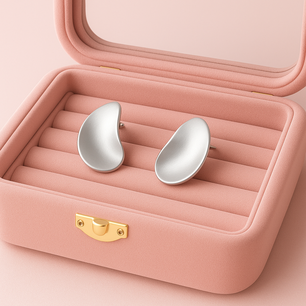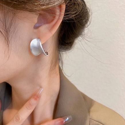These sculptural earrings boast an elegant bean-shaped silhouette, crafted in a satin-finished metallic hue that radiates understated luxury.