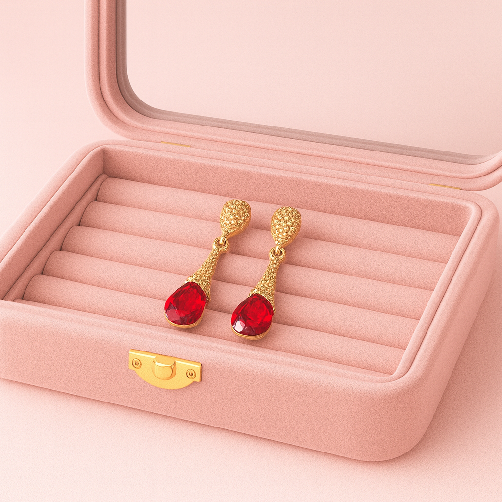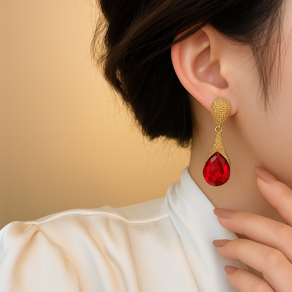 These luxurious drop earrings showcase a textured gold design ending in a vivid crimson teardrop gem.