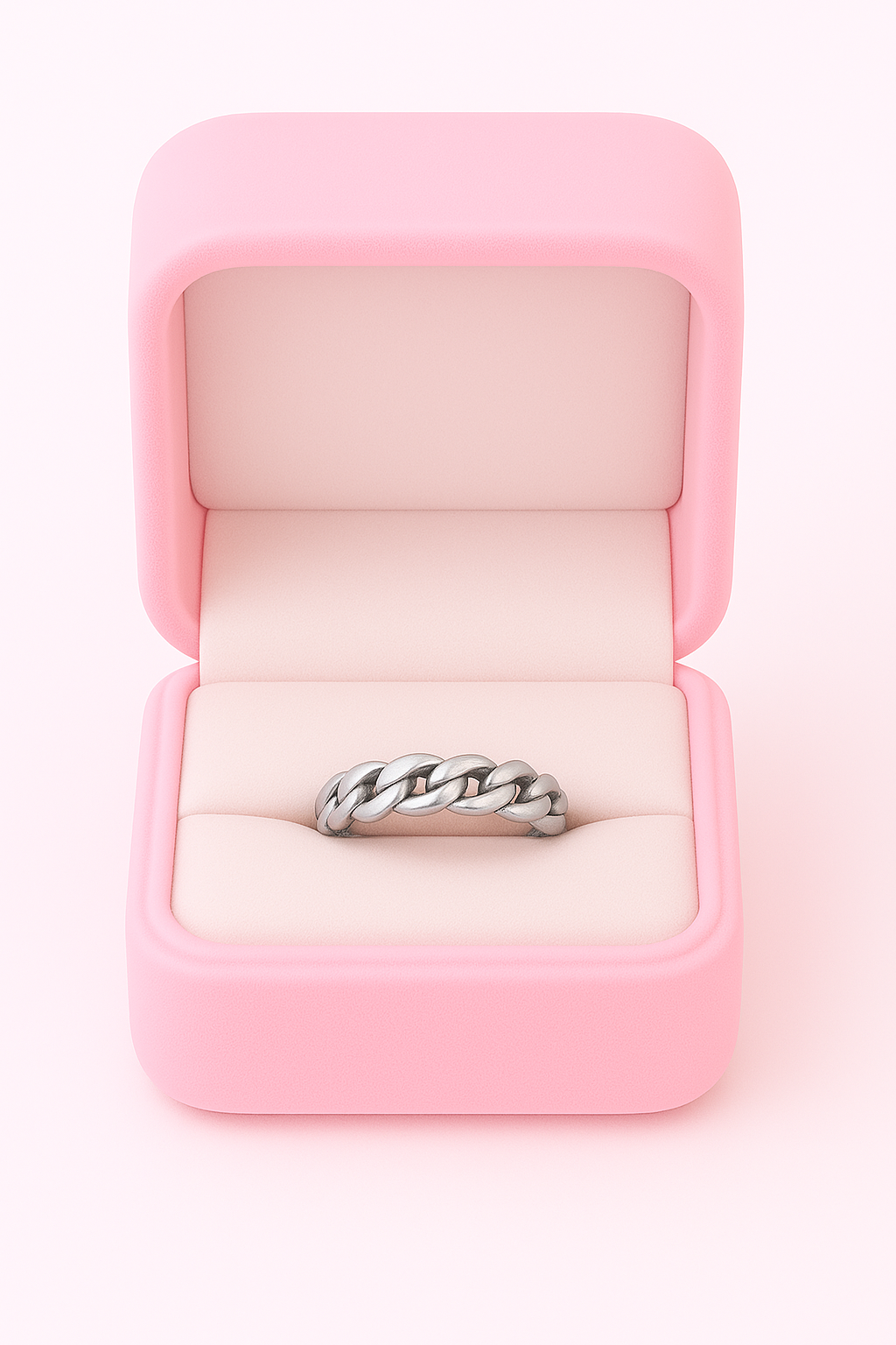 The ring is made of a shiny, silver-like metal. The top part of the ring has a design of interconnected oval links, similar to a curb chain. The rest of the ring is a simple band