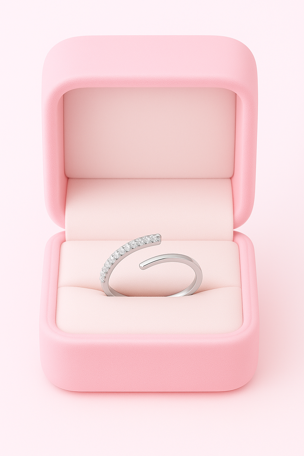 The ring is made of a shiny, silver-like metal and has a gap in the front instead of being a full circle. One end of the ring is decorated with a line of small, sparkling white stones